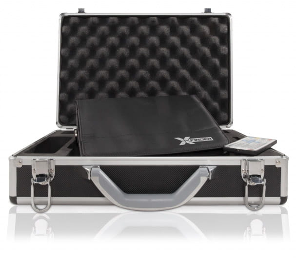 X Finder+ ma wbudowaną baterię o pojemności 5.5 Ah, którą możesz ładować z sieci 230 V lub z gniazdka samochodowego 12 V. Sam miernik ma praktyczny pokrowiec, a cały zestaw wraz z akcesoriami można przenosić w wytrzymałej walizce z przegródkami i piankowym wypełnieniem.