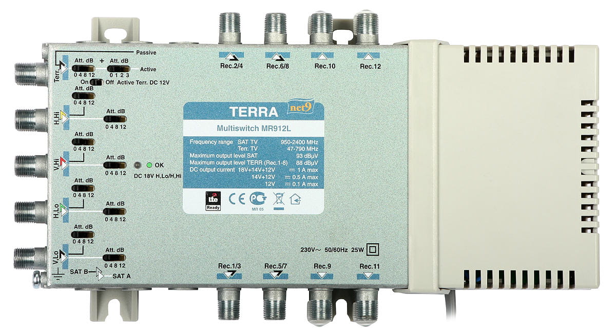 Multiswitch MR-912L posiada aktywny (wzmacniany) tor telewizji naziemnej oraz satelitarnej. Regulacja poziomu sygnału dla każdego z torów satelitarnych oraz DVB-T2 (47-790 MHz) odbywa się za pomocą dedykowanych przełączników. Taki sposób konfiguracji zapewnia większą stabilność ustawionych parametrów w stosunku do rozwiązań tradycyjnych, bazujących na potencjometrach. Dodatkowo przełącznik MR-912L R70812 został wyposażony w pasywny tor sygnału TV (5-862 MHz) do wykorzystania dla kanału zwrotnego. Urządzenie nie obsługuje jednocześnie aktywnego i pasywnego toru sygnału TV.