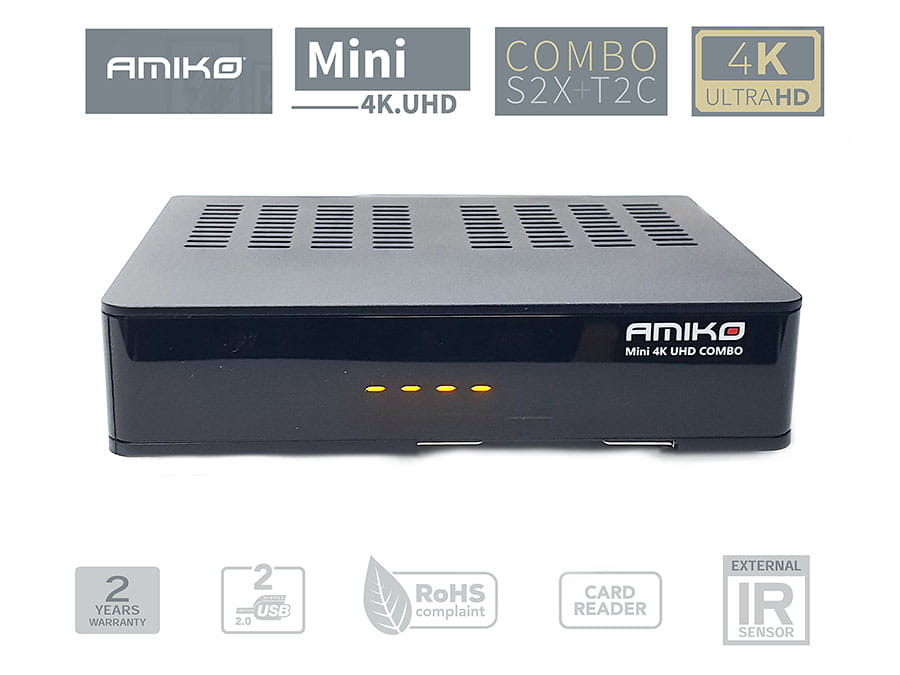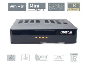 AMIKO Mini 4K Combo to odbiornik nowej generacji 4K UHD. Posiada możliwość odbioru sygnału z trzech różnych źródeł : anteny satelitarnej, anteny naziemnej oraz "kablówki". Tuner obsługuje formaty DVB-S2X, DVB-T2, DVB-T, DVB-C. Urządzenie jest kompatybilne z najnowszym system kodowania H.265 HEVC i potrafi wyświetlić obraz o maksymalnej rozdzielczości 3840x2160 czyli 4K z prędkością 60fps (kl/s). Tuner jest zgodny wstecz i obsługuje kanały nadawane w 480p, 720p i 1080p, kodowane w h.264.