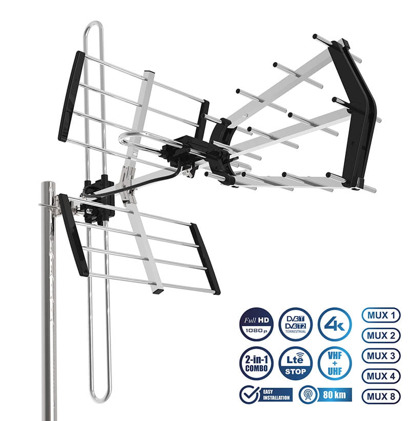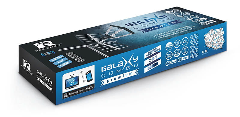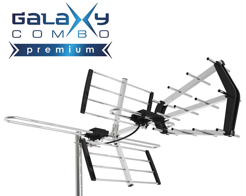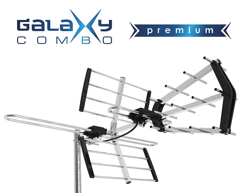 Galaxy Combo Premium to kompaktowa antena do odbioru kanałów naziemnej telewizji cyfrowej w nadawanych standardzie DVB-T lub DVB-T2. Antena odbiera kanały nadawane na częstotliwościach VHF 174-230Mhz (kanały 5-12, MUX 8 ) i UHF 470-790Mhz (kanały 21-60, MUX 1,2,3). Konstrukcja anteny pozwala na ustawienie dipola służącego do odbioru częstotliwość VHF poziomo - do odbioru w polaryzacji H lub pionowo do odbioru w polaryzacji V. Antena posiada wbudowany filtr LTE do blokowania zakłóceń pochodzących od internetu LTE.