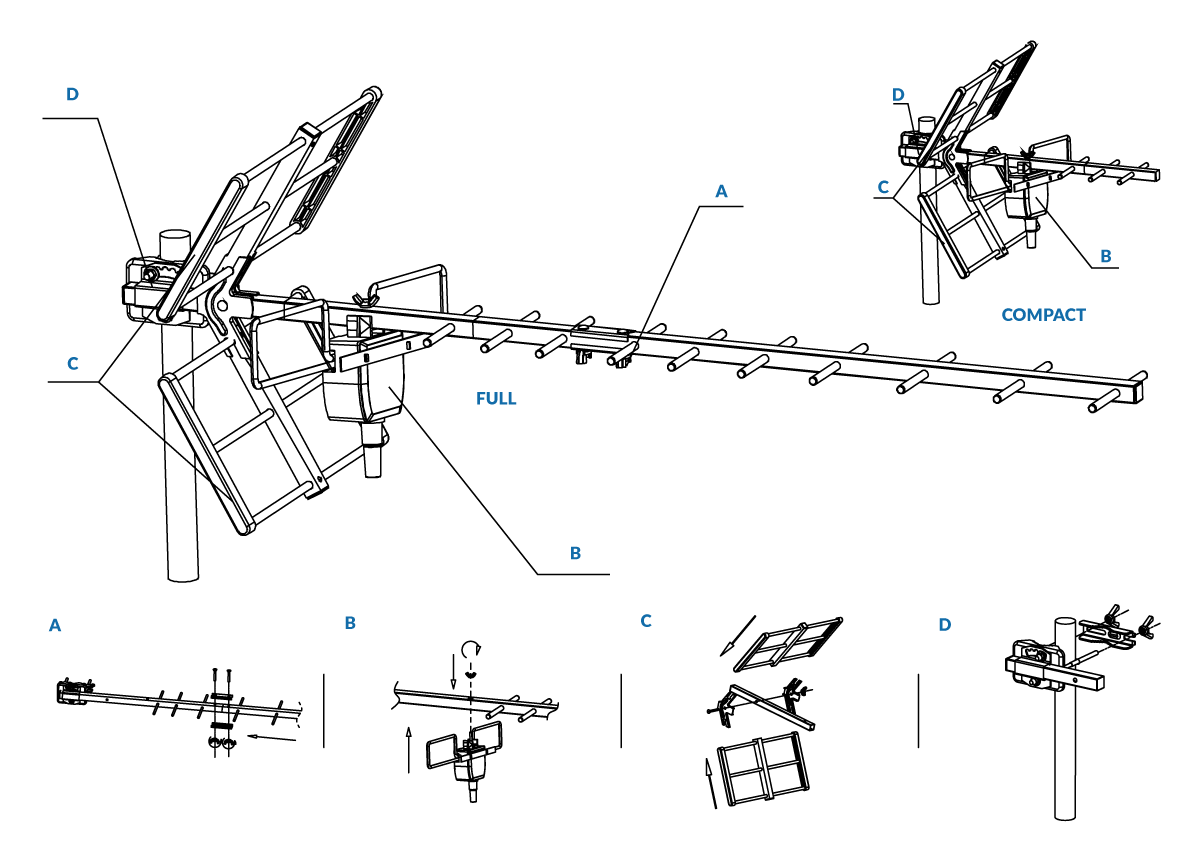 Złożenie anteny zajmuje mniej niż 3 minuty i nie wymaga zastosowania żadnych narzędzi. Przemyślana konstrukcja jest przyjazna w montażu. Reflektor anteny montowany jest na szybki, ale pewny zatrzask. Puszka antenowa z dipolem pętlowym montowana na śrubie z nakrętką motylkową. Do cybanta dołączono 2 nakrętki motylkowe. Do ich dokręcenia nie jest potrzebny żaden klucz.