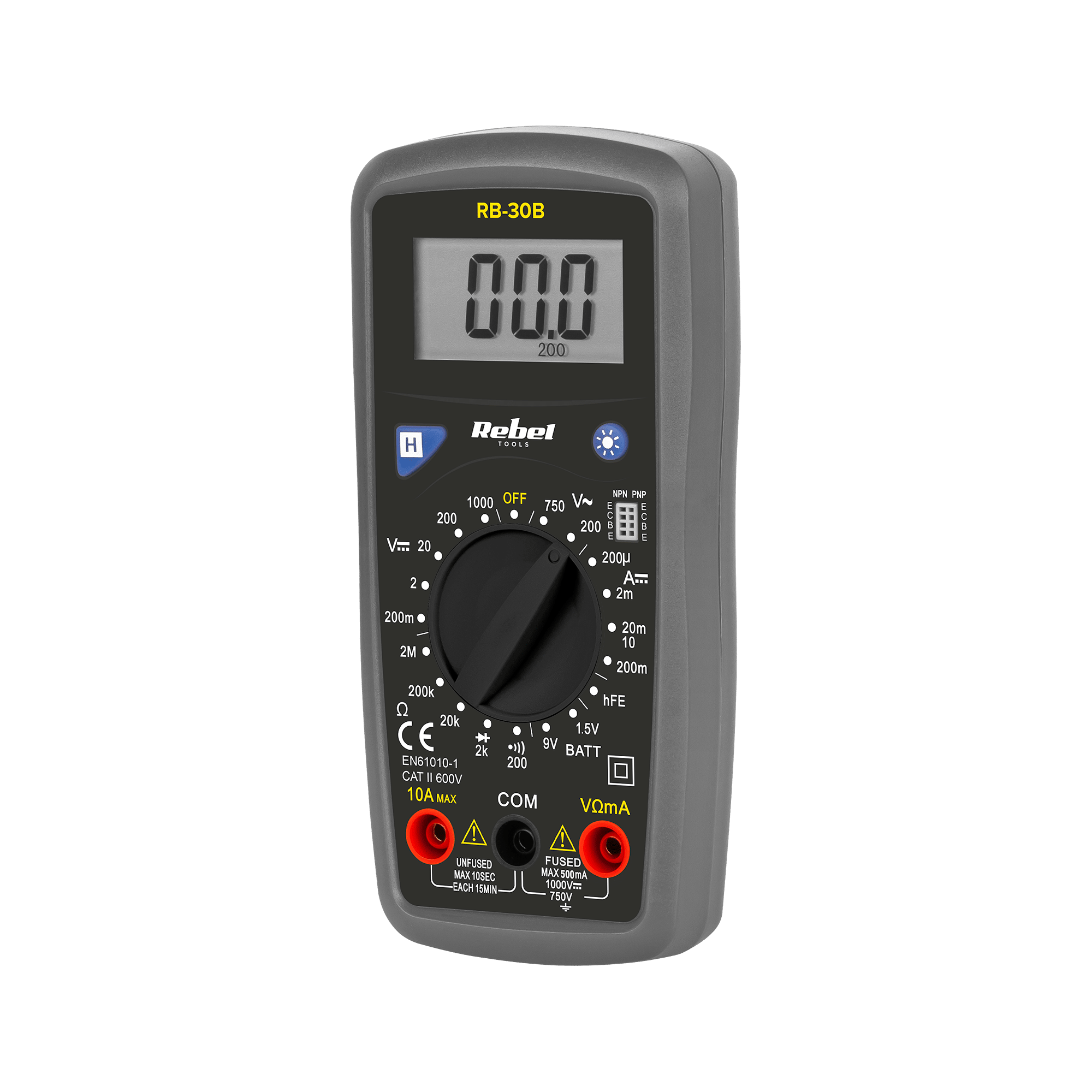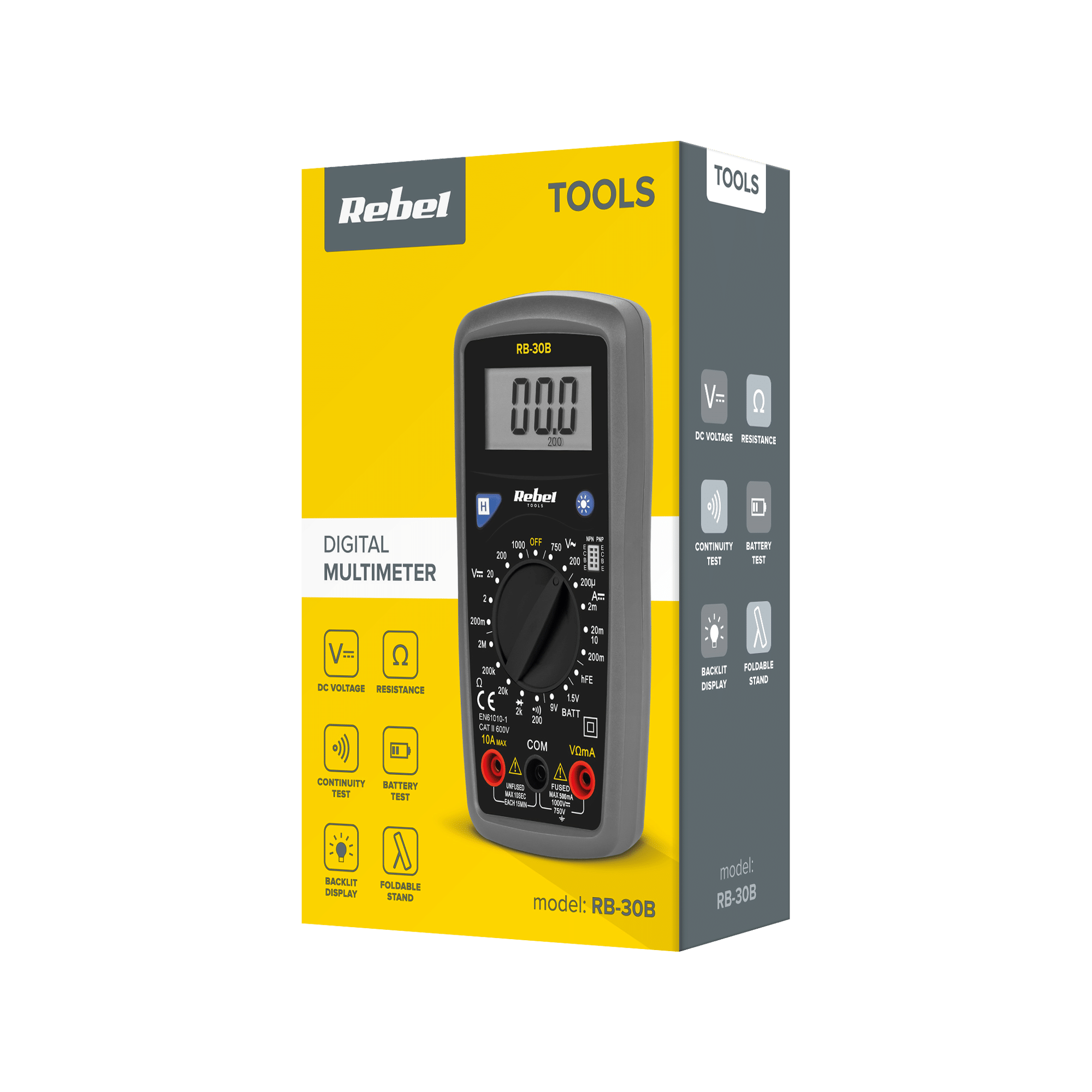 Miernik Rebel Tools RB-30B to uniwersalne narzędzie do wykonywania podstawowych pomiarów elektrycznych i elektronicznych. Jest równie przydatnym narzędziem w domu jak młotek, kombinerki czy klucz 10 mm. Bez trudu można sprawdzić nim napięcie zasilające w gniazdku czy ciągłość obwodu. Przy instalacjach antenowych pomoże sprawdzić poprawną pracę zasilacza antenowego lub upewnić się, że napięcie dociera do wzmacniacza. Można również przetestować napięcie zasilające konwerter satelitarny z tunera SAT.