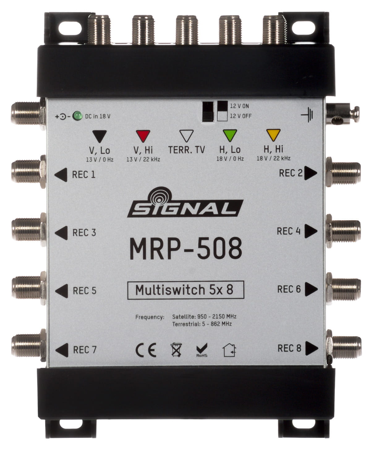 Multiswitch firmy Signal posiadający 8 wyjść do gniazd RTV oraz 4 wejścia dla konwertera satelitarnego "quattro" i anteny naziemnej DVB-T. Multiswitch Signal MRP-508 może obsłużyć instalację np. w domu jednorodzinnym lub niewielkim pensjonacie. Do ośmiu gniazd możemy doprowadzić sygnał satelitarny i naziemny za pomocą jednego przewodu. Wszystkie przewody od gniazd muszą być doprowadzone do miejsca gdzie będzie zamontowany multiswitch (tzw. topologia gwiazdy).