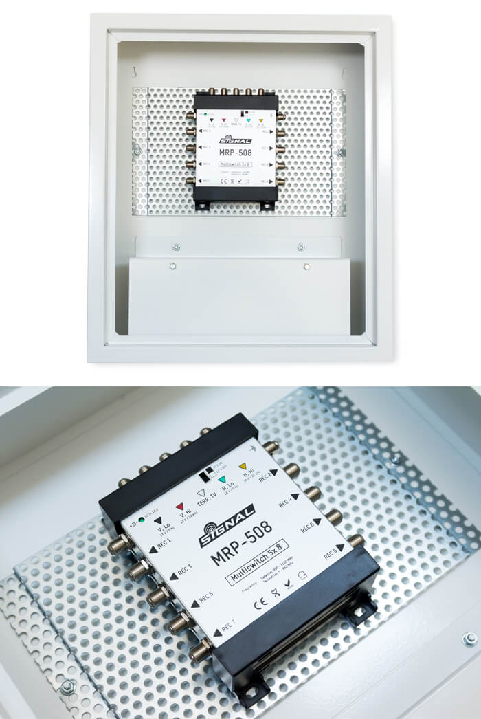 Na poniższym przykładzie multiswitch Signal MRP-508 w telekomunikacyjnej skrzynce mieszkaniowej OMT-35N.