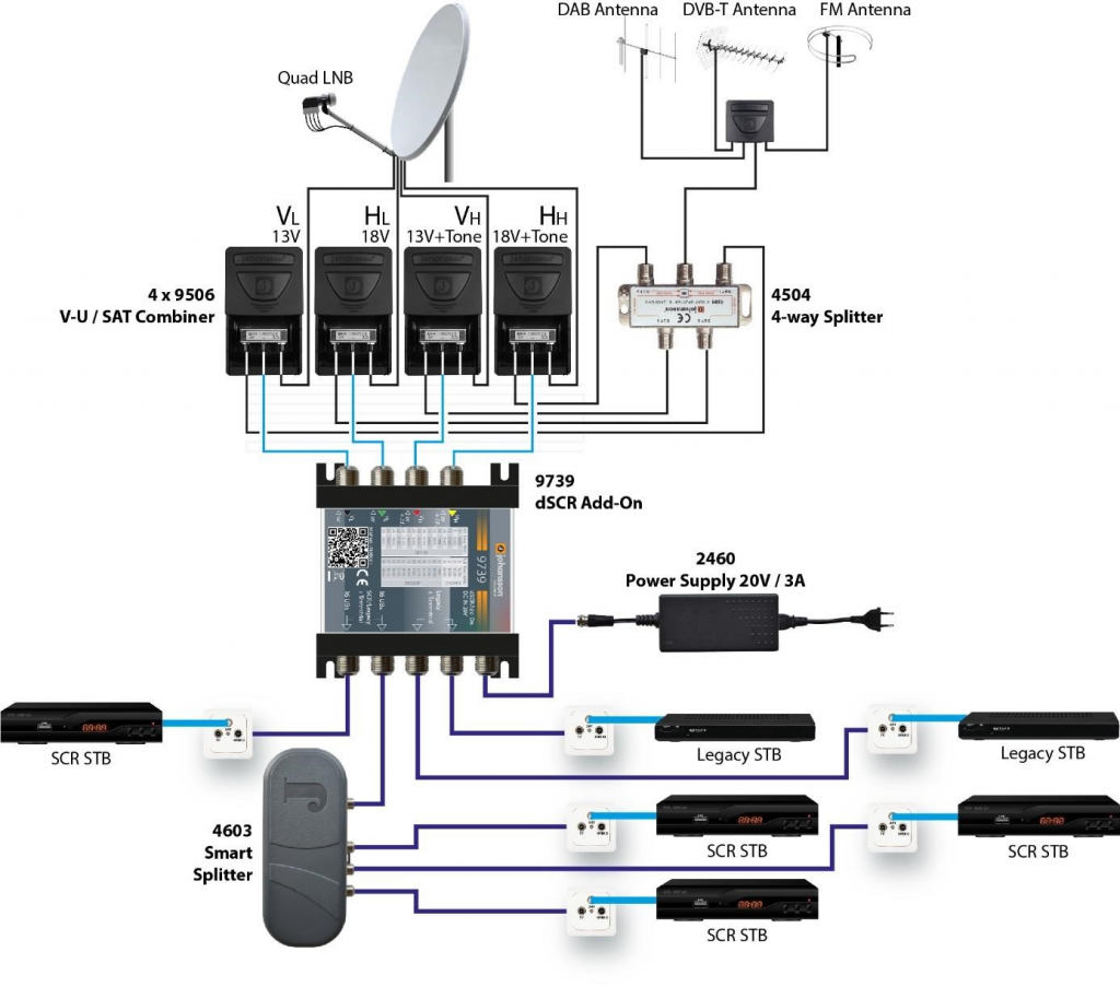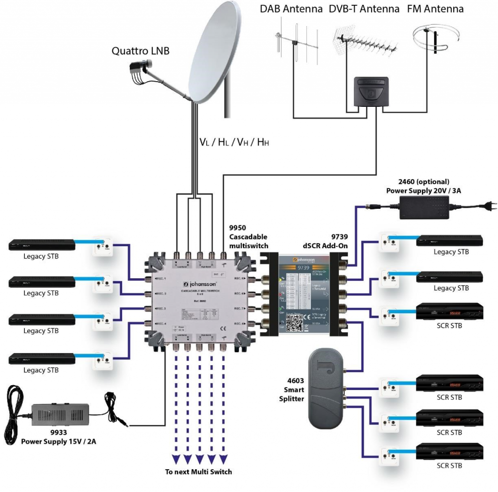 Multiswitch Unicable 4/2 Johansson 9739 możemy wykorzystać do stworzenia instalacji od podstaw. Jednak jeżeli chcemy dołączyć telewizję naziemną, konieczne będzie zsumowanie sygnału sat z anteną naziemną jeszcze przed wejściem sygnału do multiswitcha. Do zsumowania możemy użyć np. sumatora SCQ-410 firmy Telmor lub zwrotnicy DSE SSC-4. Poniżej schemat przedstawiający takie wykorzystanie urządzenia.
