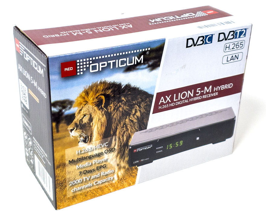 Opticum AX Lion 5-M HYBRID to nowy model tunera naziemnej i kablowej telewizji cyfrowej. Głowica hybrydowa wyróżnia się obsługą nowego standardu DVB-T2 H.265 oraz DVB-T H.264. Obsługuje także standard telewizji kablowej DVB-C.