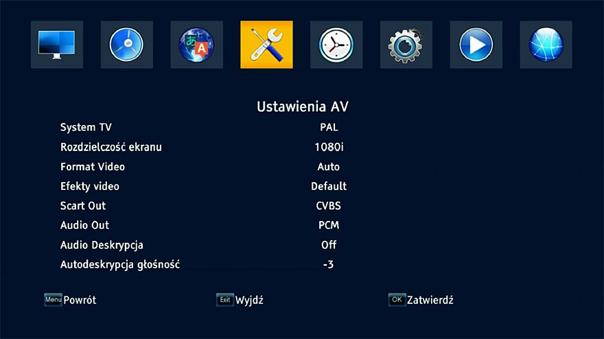 Wygląd menu ustawień obrazu i dźwięku Opticum AX Lion 5-M HYBRID: