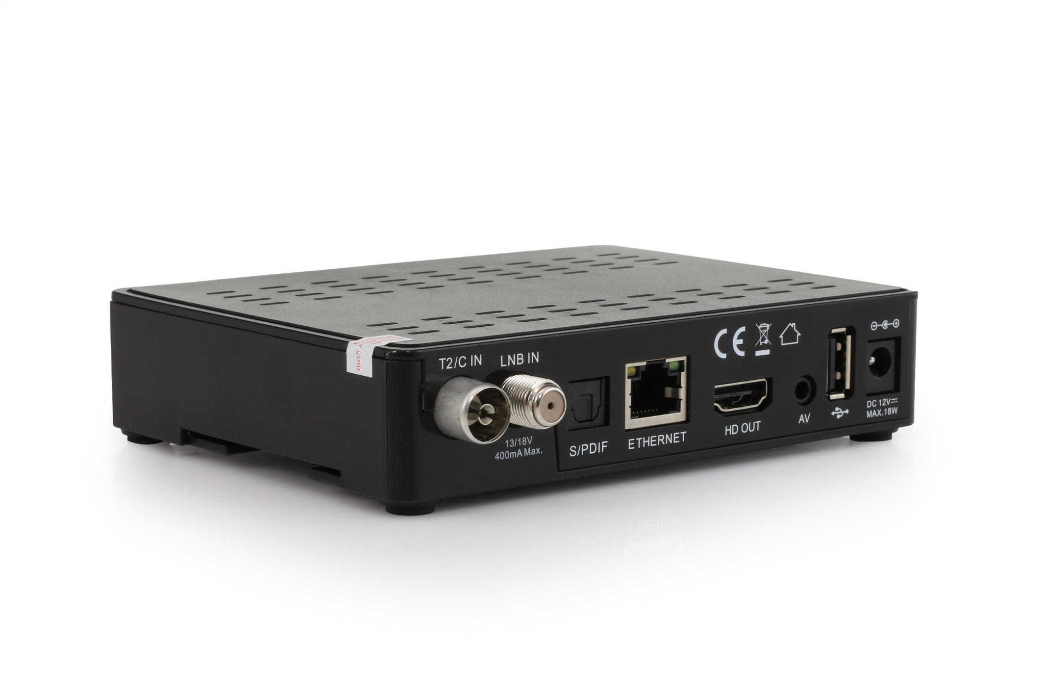 Z tyłu dekodera umiejscowiono jedno wejście antenowe telewizji satelitarnej głowicy DVB-S2, jedno uniwersalne gniazdo antenowe głowicy obsługującej standardy DVB-T / DVB-T2 / DVB-C w systemie kompresji HEVC H.265, port Ethernet LAN RJ-45 do podłączenia urządzenia do internetu, port wideo HDMI, cyfrowe optyczne wyjście dźwięku S/PDIF, złącze USB 2.0, do którego możemy podłączyć np. pendrive do nagrywania lub kartę sieciową wi-fi oraz złącze A/V jack 3,5mm, które umożliwia podłączenie odbiornika do wzmacniacza lub telewizora starego typu bez złącza hdmi (kabel w zestawie). Tuner posiada także czytnik kart dekodujących w systemie CONAX np, Smart HD.