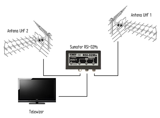 Przykładowe wykorzystanie RSI-02Ms jako sumator do zsumowania sygnału z dwóch anten DVB-T2.