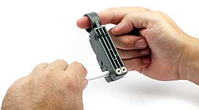 Zasada działania urządzenia. Wystarczy założyć na przewód, pokręcić i pociągnąć, a kabel koncentryczny jest już przygotowany do zakręcenia F-ki.