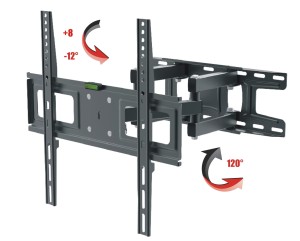 Uchwyt TV LCD 23 - 56" AX Mercury Black pozwala na regulację pochylenia/odchylenia w zakresie +8 / -12° oraz skręcenie telewizora w lewo lub prawo pod kątem 120°. Kąt regulacji obrotu telewizora wokół własnej osi wynosi 3°. Każda w wymienionych regulacji jest płynna. Minimalna odległość od ściany wynosi 70mm, a maxymalna to 350mm.