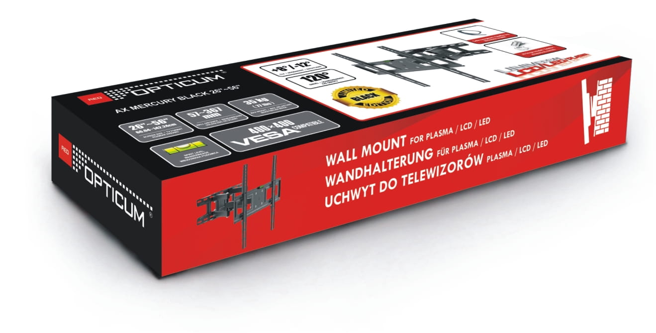 AX Mercury Black jest zgodny z podanymi standardami VESA (rozmiarem otworów montażowych w telewizorze): 100 x 100, 200 x 100, 200 x 200, 300 x 200, 300 x 300, 400 x 200, 400 x 300, 400 x 400. Co oznacza, że można zamontować każdy telewizor w rozmiarach od 23 do 56 cali.