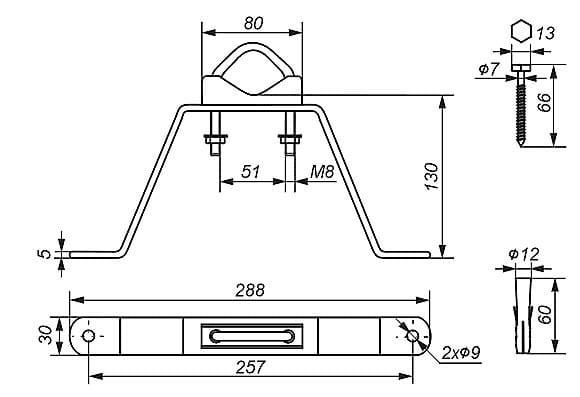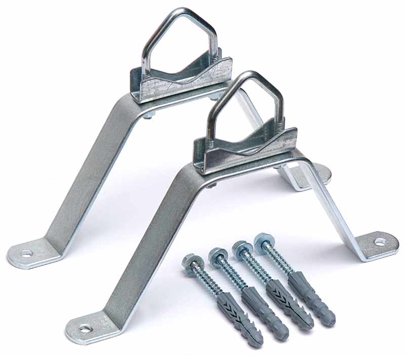 Uchwyt służacy do zamocowania masztu (rury) np. do komina. - Odległość od ściany: 13cm - Szerokość całkowita: 28,8cm - Płaskownik: 288x5mm - Otwory: 8 x Ø 9mm - Uwagi: uchwyt stalowy, cynkowany galwanicznie, w komplecie 2 cybanty i 4 wkręty z kołkami