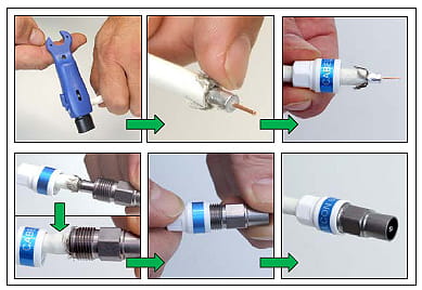 Montaż wtyku odbywa się poprzez przygotowanie przewodu, nasunięcie plastikowej nasadki, założenie wtyku na przewód tak, aby końcowa tuleja znalazła się pod zewnętrznym płaszczem kabla oraz nakręcenie nasadki na gwintowany wtyk. Cała operacja zajmuje nie więcej, niż kilkanaście sekund.