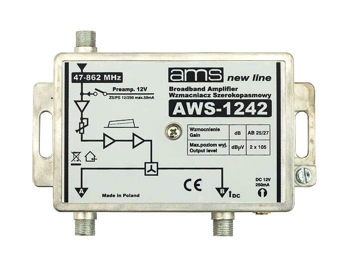 Regulowany wzmacniacz antenowy AWS-1242 może znaleźć zastosowanie w niewielkich instalacjach antenowych gdzie zachodzi potrzeba zarówno wzmocnienia jaki i rozdzielenia sygnału RTV.