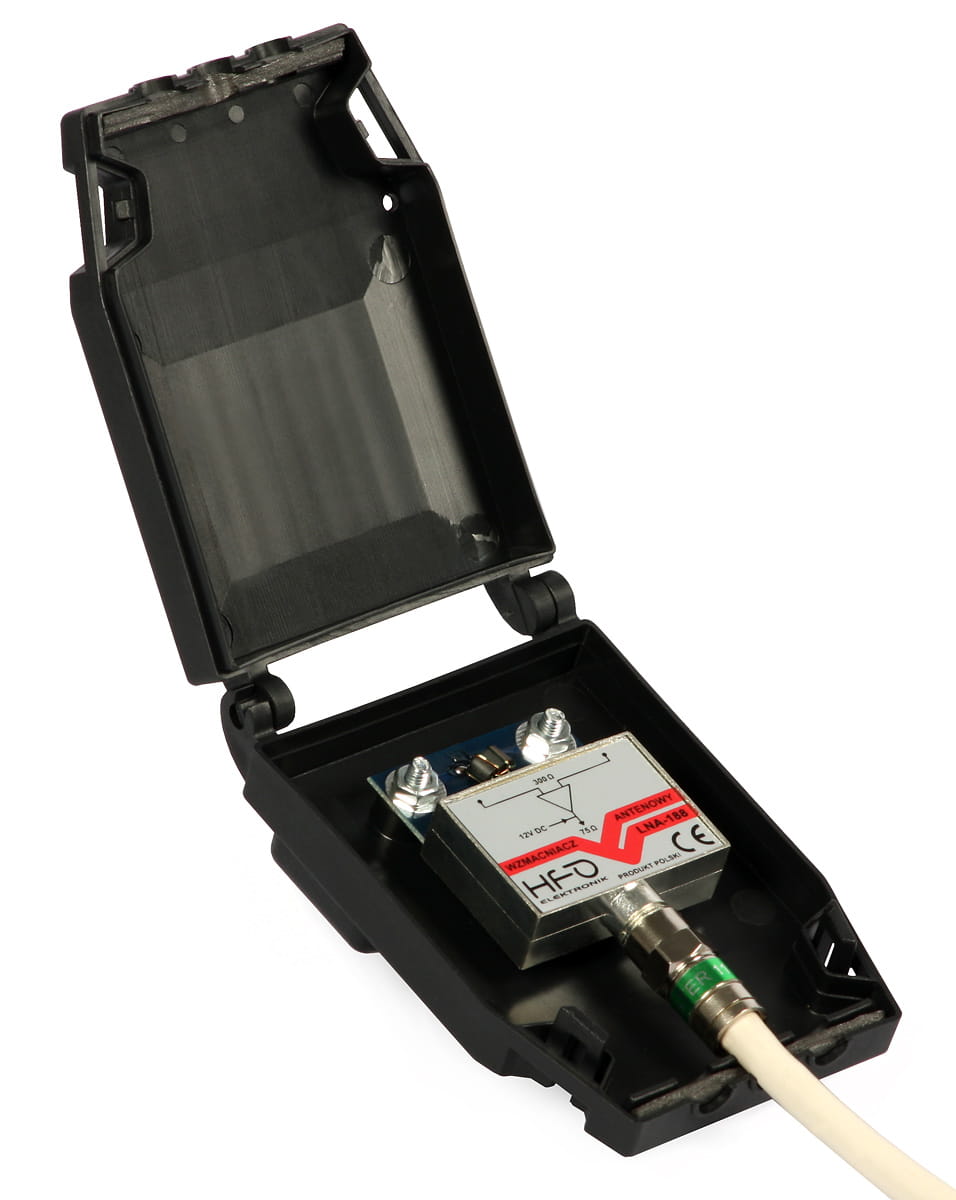 Puszka antenowa przeznaczona do anten marki Dipol i innych. Do puszki mieści się typowy wzmacniacz LNA lub symetryzator.