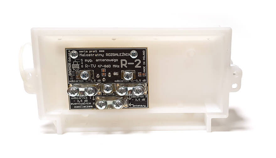 Zewnętrzny Rozgałęźnik Badmor R-2 umożliwia podłączenie do jednej anteny dwóch odbiorników TV.