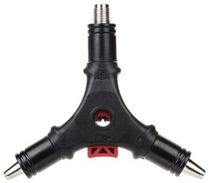 Ucięty kabel antenowy wsadzamy do środkowego otworu ściągacza. Aby włożyć kabel do otworu należy nacisnąć do oporu czerwony przycisk. Po włożeniu kabla puszczamy czerwony przycisk i kilkukrotnie obracamy ściągacz dookoła osi kabla.