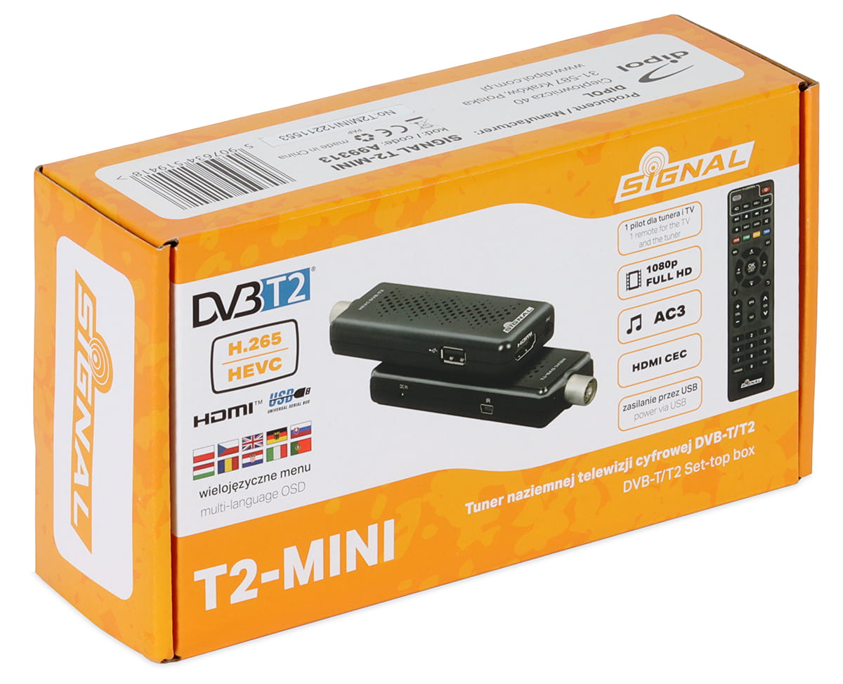 Odbiornik Signal T2-MINI odbiera darmowe kanały nadawane w cyfrowej telewizji naziemnej DVB-T2 w technologii kodowania obrazu HEVC (H.265/MPEG-H) oraz H.264/MPEG-4 z dźwiękiem Dolby E-AC-3.
