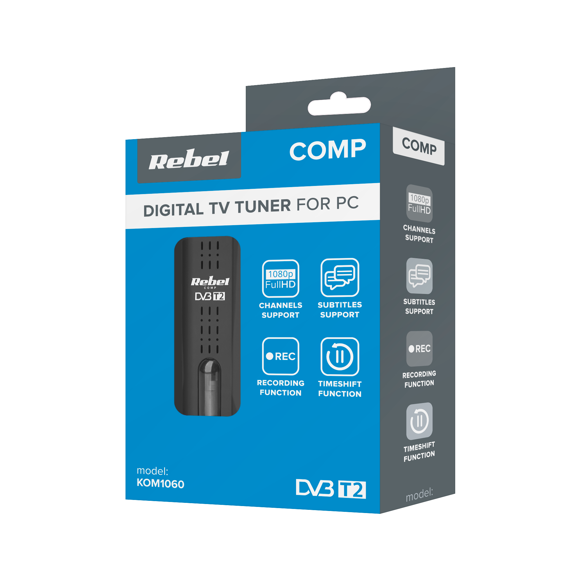Tuner Rebel KOM1060 jest kompaktowym tuner ze złączem USB umożliwiającym odbiór telewizji naziemnej DVB-T i DVB-T2/HEVC na laptopie lub komputerze PC. Dodatkowo tuner może odbierać również sygnał telewizji kablowej DVB-C (po podłączeniu do sieci z takim sygnałem) oraz cyfrowego radia DAB+.