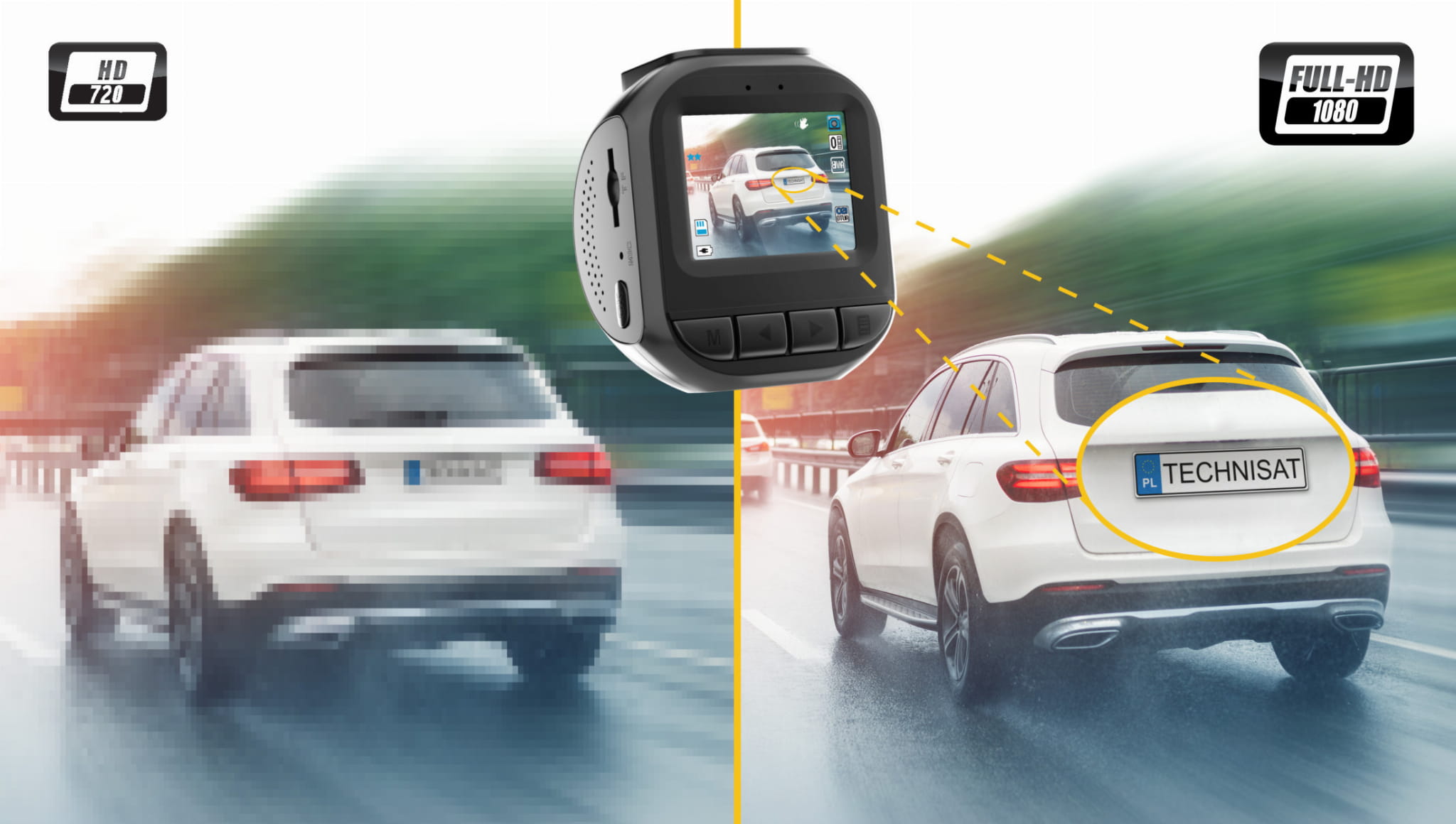 Rozdzielczość kamery samochodowej jest ważna, bo pozwala np. na odczyt tablic rejestracyjnych sprawcy wypadku. ROADCAM 1 CE nagrywa w rozdzielczości Full HD (1920x1080).