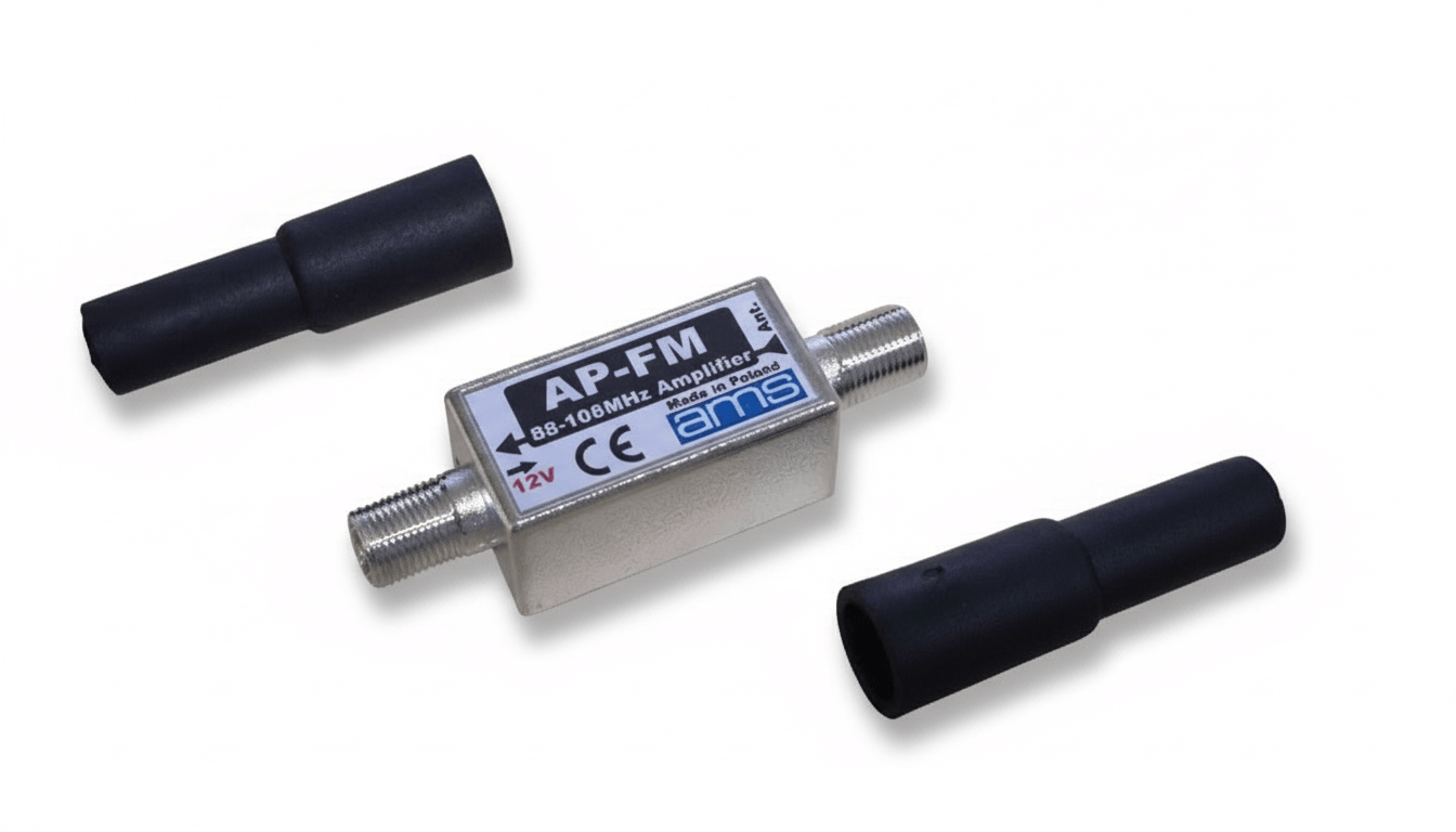 AMS AP-FM to wysokiej jakości wzmacniacz antenowy przeznaczony do wzmacniania sygnału w paśmie FM (zakres 88-108 MHz). Wzmocnienie wynosi 18 dB. Wzmacniacz może być zamontowany zarówno na zewnątrz jaki i wewnątrz - obudowa wzmacniacza jest szczelna, a złącza można zabezpieczyć dodatkowo gumowymi osłonami jakie znajdują się w komplecie.