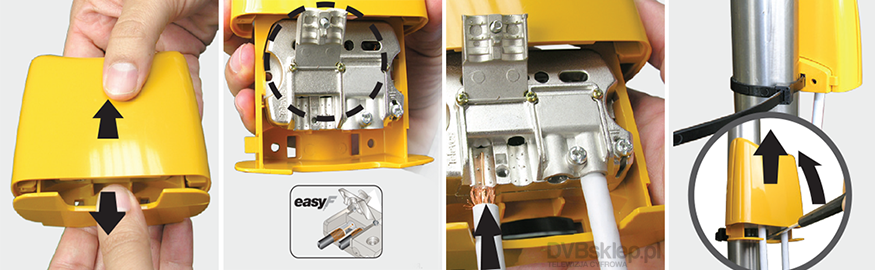 Zwrotnica wyposażona w złącza easyF ułatwiająca montaż kabla antenowego.