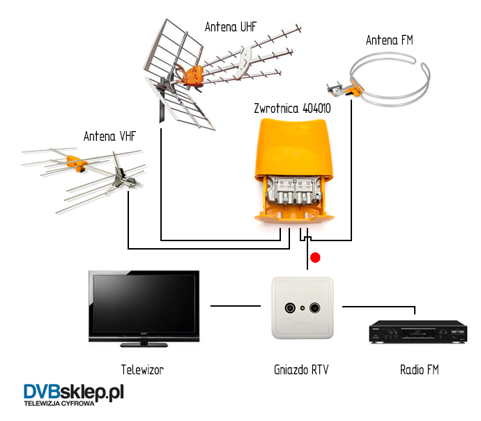 Przykładowy schemat instalacji antenowej UHF, VHF ze zwrotnicą Televes 404010: